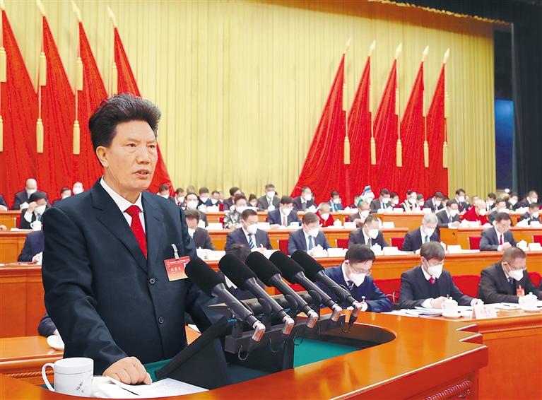 1月14日上午,自治區(qū)第十二屆人民代表大會(huì)第一次會(huì)議舉行第二次全體會(huì)議。洛桑江村向大會(huì)作自治區(qū)人大常委會(huì)工作報(bào)告。 記者 唐斌 攝