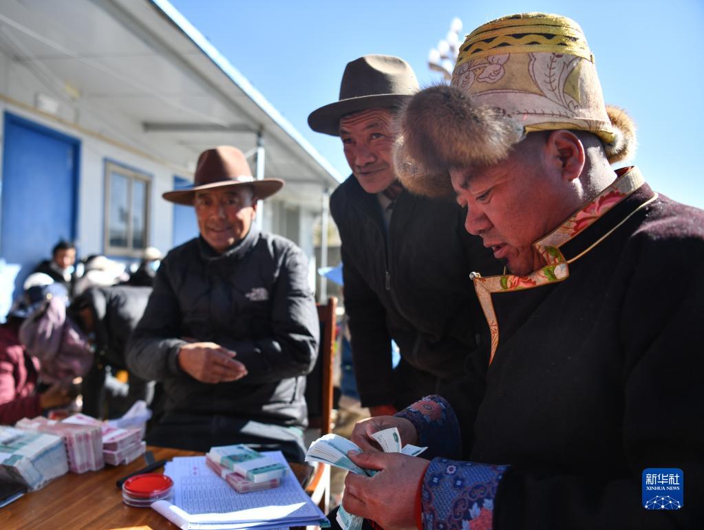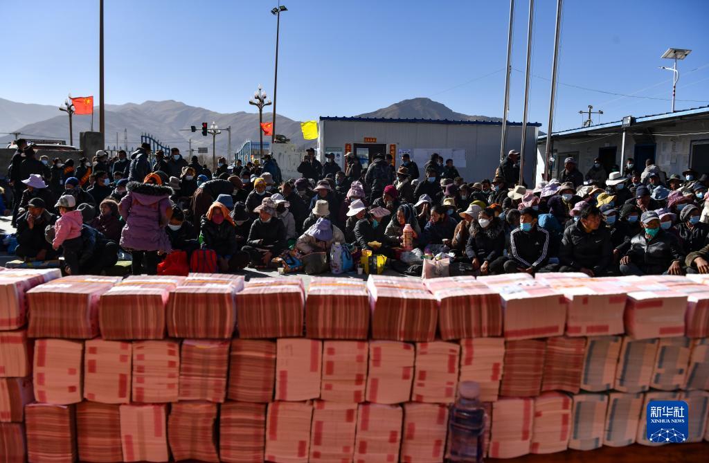 滴新村村民在現(xiàn)場領(lǐng)取分紅現(xiàn)金(2月2日攝)。新華社記者 晉美多吉 攝