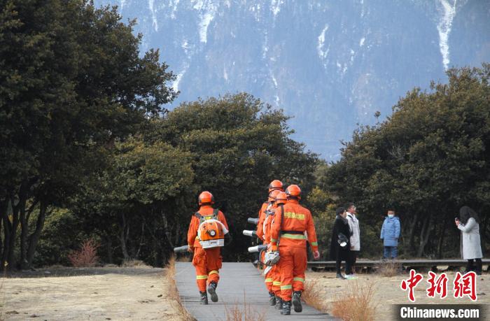 圖為森林消防員在景區(qū)重點(diǎn)區(qū)域普及防火知識(shí)?!×种ナ猩窒拦﹫D