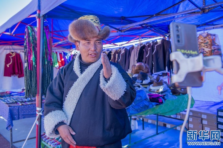 2月6日,商戶在交易會(huì)上通過(guò)直播介紹年貨。新華網(wǎng) 旦增努布 攝