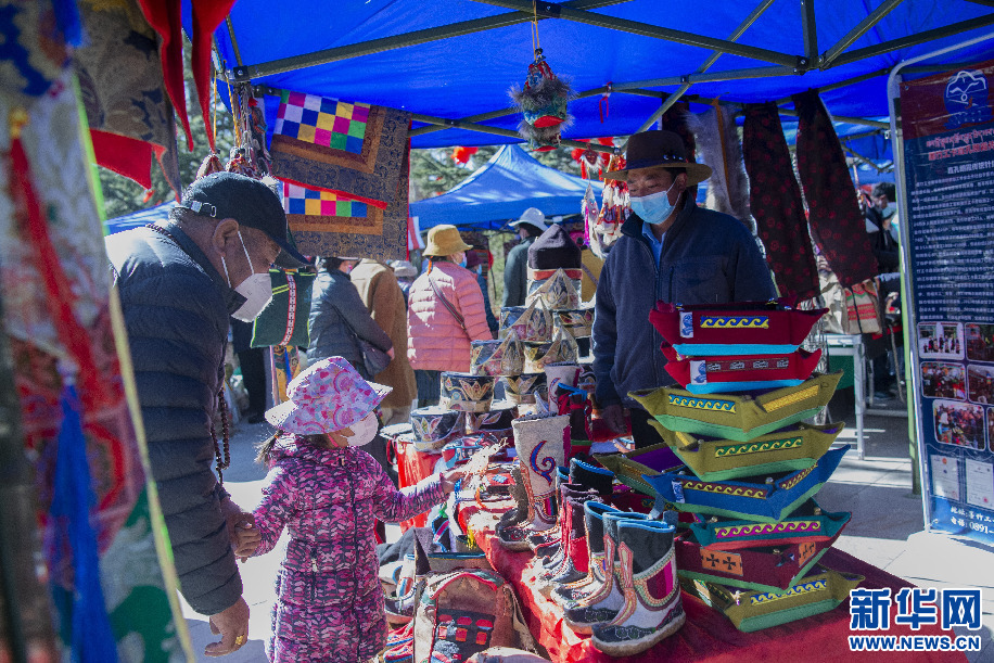 2月14日,群眾在直孔朗霞傳統(tǒng)針織加工專業(yè)合作社展位上挑選由傳統(tǒng)針織技藝制作的年貨。新華網(wǎng) 旦增努布 攝