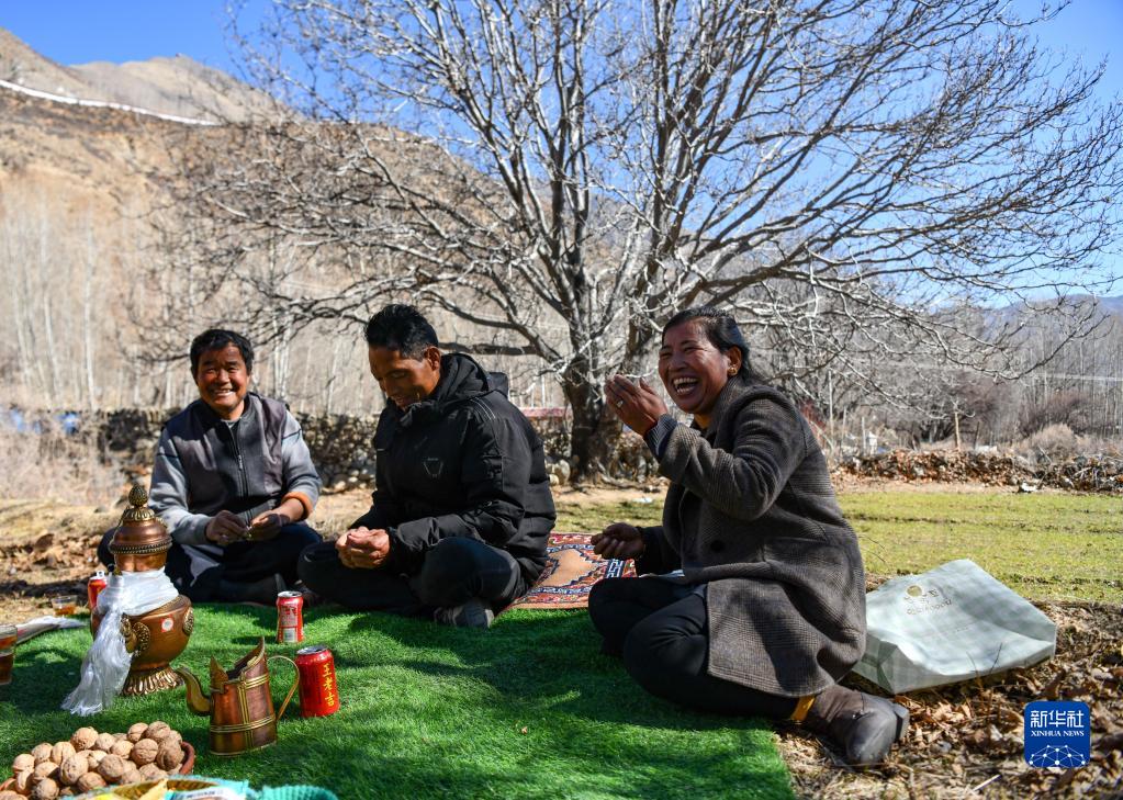 山南市加查縣拉崗村的村民在核桃樹(shù)下聊天拉家常(2月1日攝)。新華社記者格桑邊覺(jué) 攝
