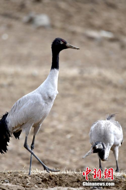 2月19日,黑頸鶴與幼鶴在田間覓食。