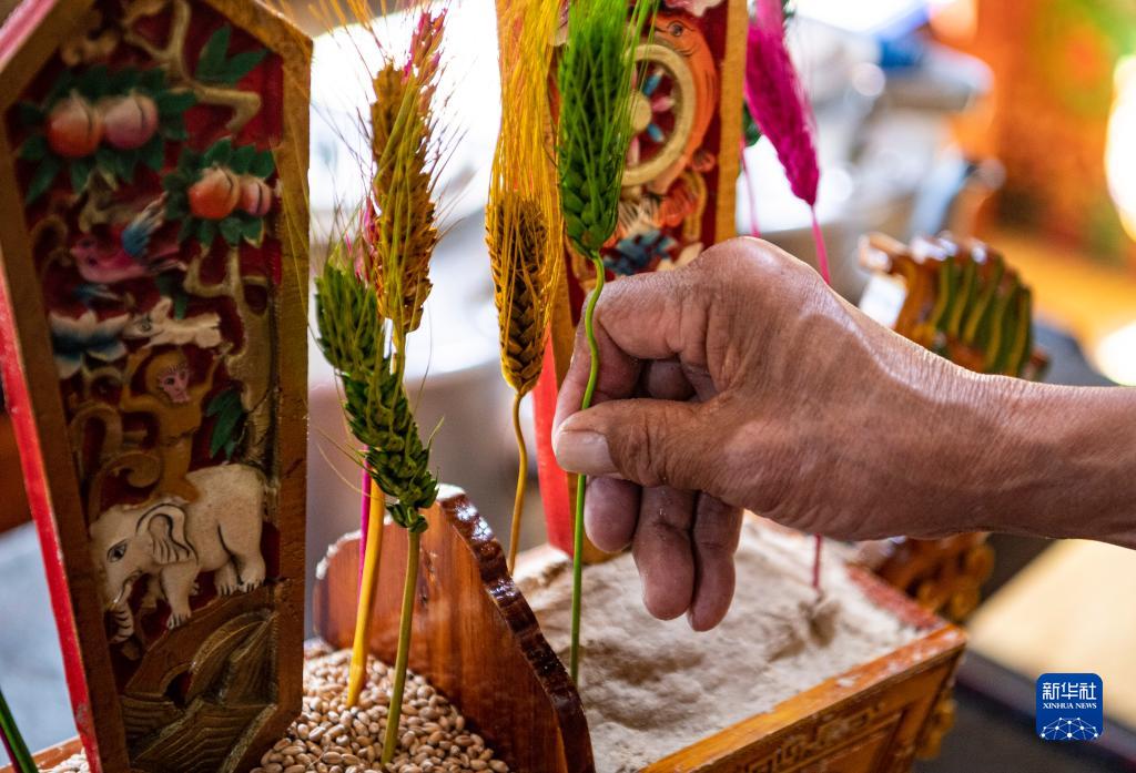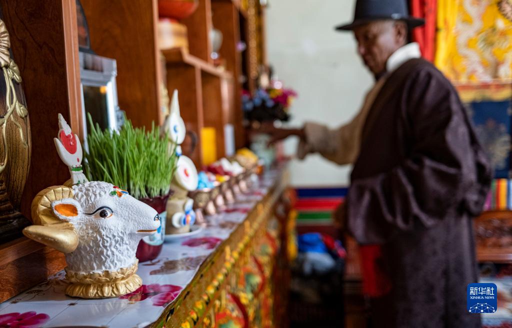 2月20日,在位于西藏拉薩市墨竹工卡縣門巴鄉(xiāng)的家中,扎西次仁用五彩青稞穗裝點象征吉祥的“切瑪”。新華社發(fā)(丁增尼達(dá) 攝)