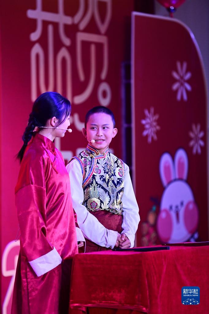 2月21日,在西安市浐灞第一中學舉行的藏歷新年團拜活動上,漢藏學生一起表演相聲。新華社記者 李一博 攝