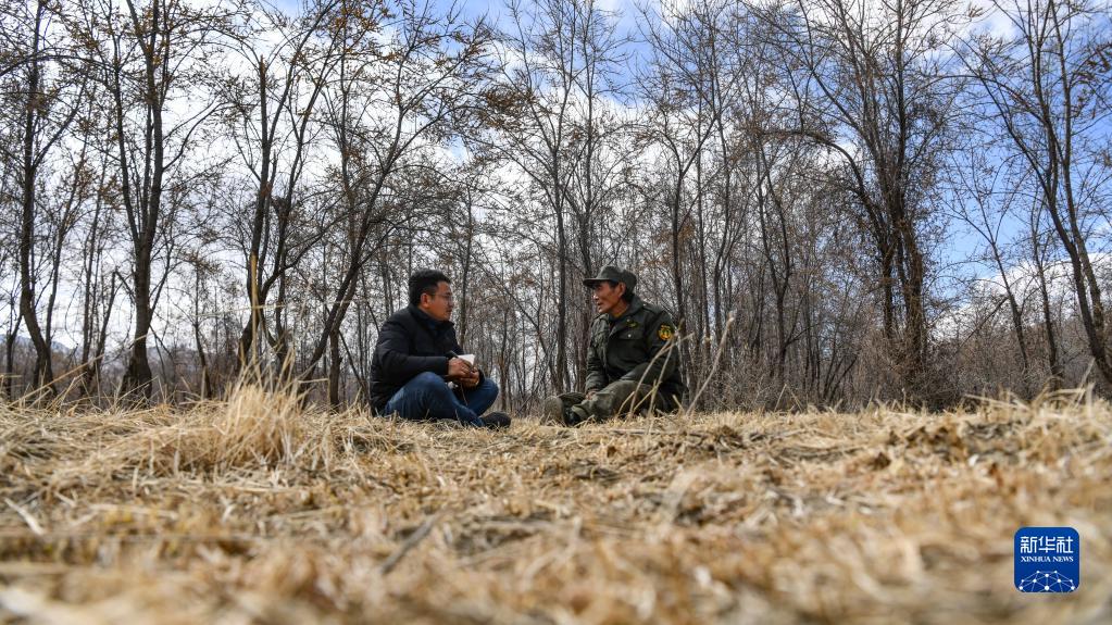 在西藏山南市隆子縣,扎西江村(左)與護林員在林中席地而坐,交流當?shù)厣鷳B(tài)環(huán)境問題(2月14日攝)。新華社記者 晉美多吉 攝