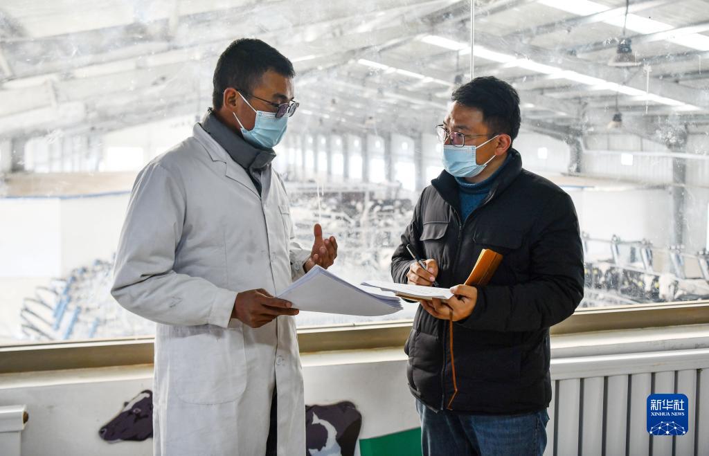 扎西江村(右)在隆子縣一家標準化奶牛養(yǎng)殖基地調(diào)研當?shù)禺a(chǎn)業(yè)發(fā)展和帶動群眾增收情況(2月14日攝)。新華社記者 晉美多吉 攝