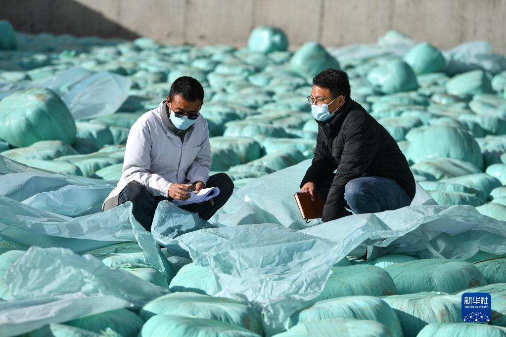 扎西江村(右)在隆子縣一家標準化奶牛養(yǎng)殖基地查看牛飼料,調(diào)研當?shù)禺a(chǎn)業(yè)發(fā)展情況(2月14日攝)。新華社記者 晉美多吉 攝
