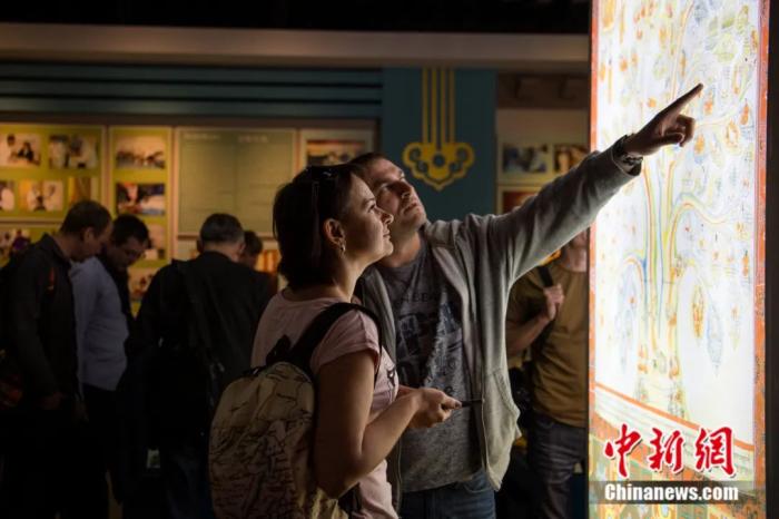 烏克蘭游客在西藏藏醫(yī)院觀看由藏醫(yī)藥經(jīng)典著作《四部醫(yī)典》而繪制的彩色掛圖。 何蓬磊 攝