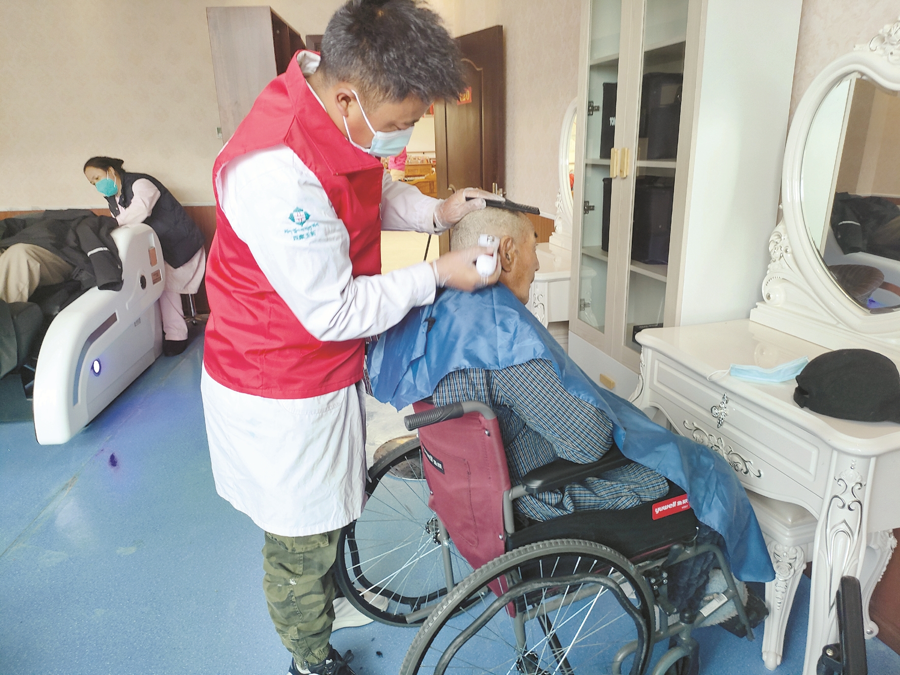 圖為學(xué)雷鋒活動日當(dāng)天,志愿者為市社會福利院老人理發(fā)。 拉薩融媒記者 李從芳攝