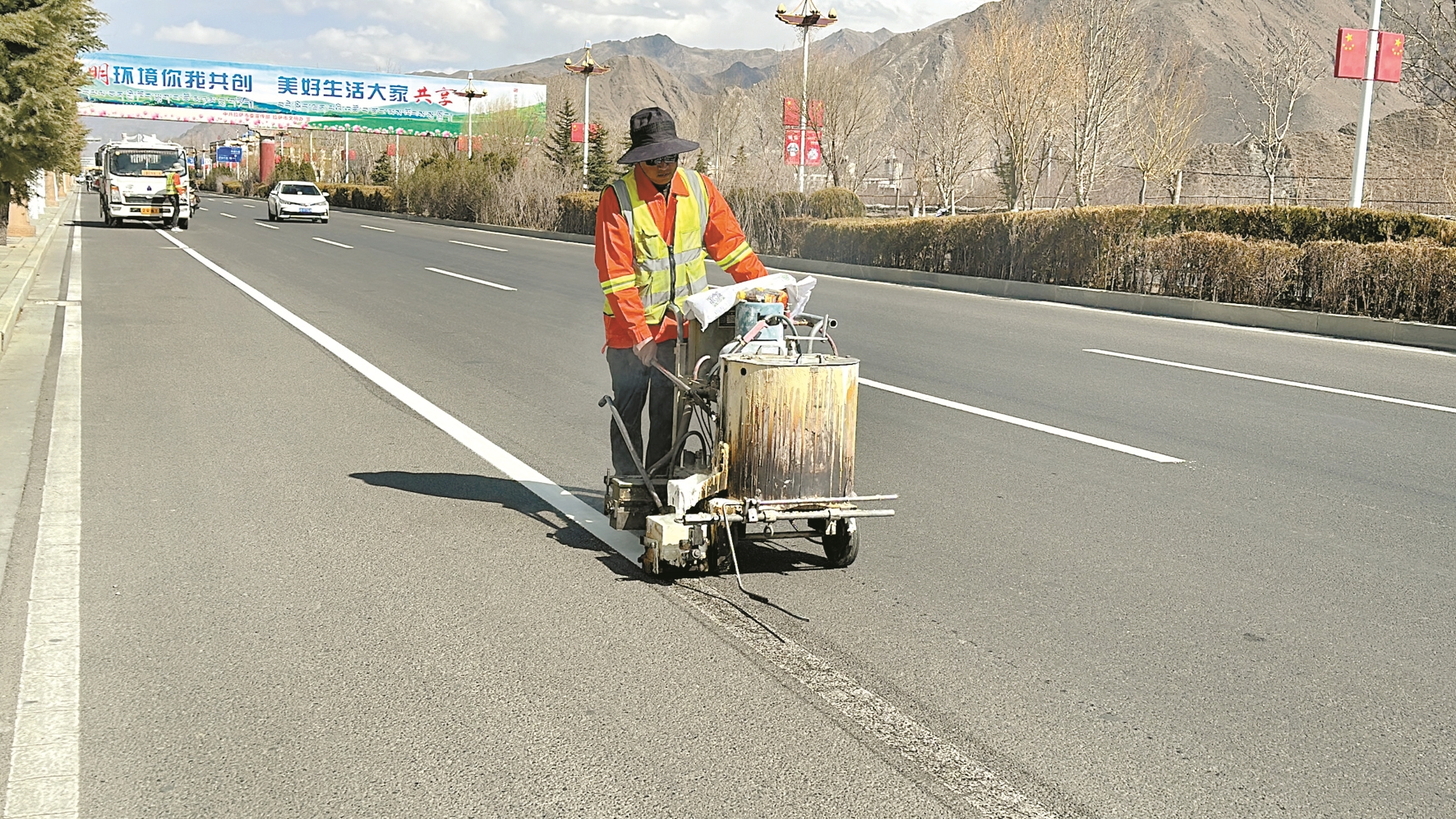 圖為工作人員正在南環(huán)318沿線施劃交通標(biāo)線。 拉薩融媒記者 左曉萌攝