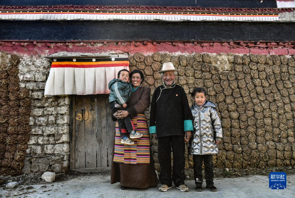 達(dá)國(guó)杰(右二)和家人在家門(mén)前合影(2021年3月22日攝)。新華社記者 孫瑞博 攝