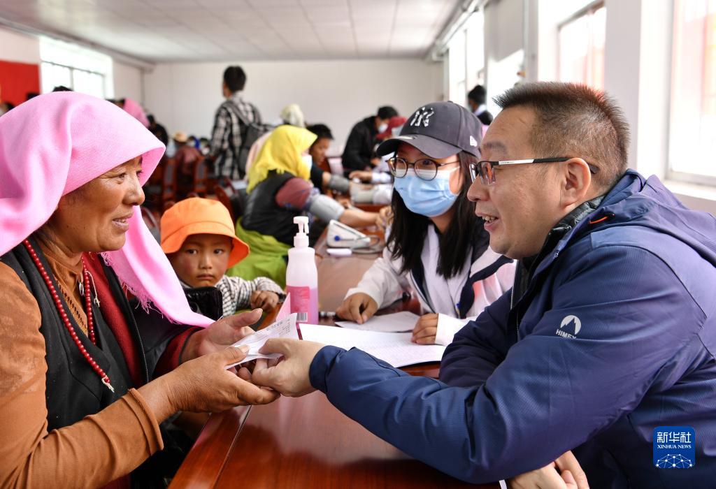 北京市第七批“組團(tuán)式”援藏醫(yī)療隊(duì)專家、拉薩市人民醫(yī)院副院長(zhǎng)汪紅兵(右)為居民義診(2022年6月9日攝)。新華社記者 張汝鋒 攝