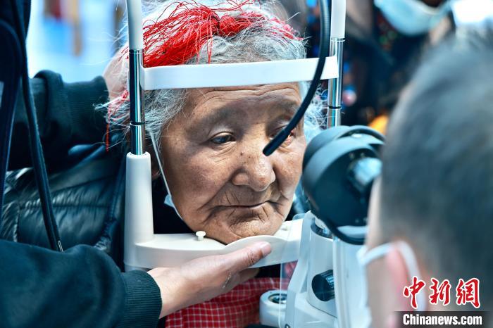 圖為專業(yè)眼科醫(yī)生為老人檢測(cè)視力?!「裆?攝