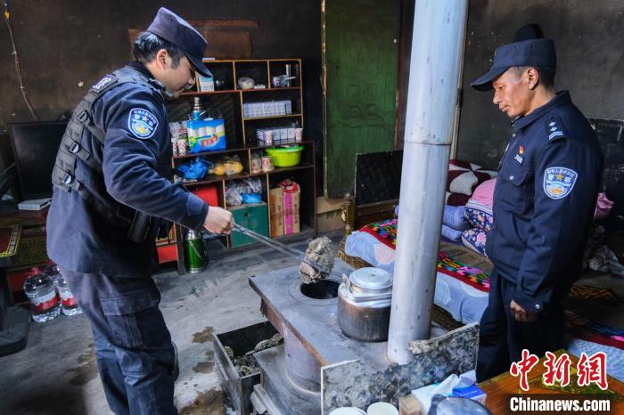 圖為西藏山南移民管理警察向軍(左)在公漳浦執(zhí)勤點(diǎn)為火爐添加風(fēng)干牦牛糞?!〗w波 攝