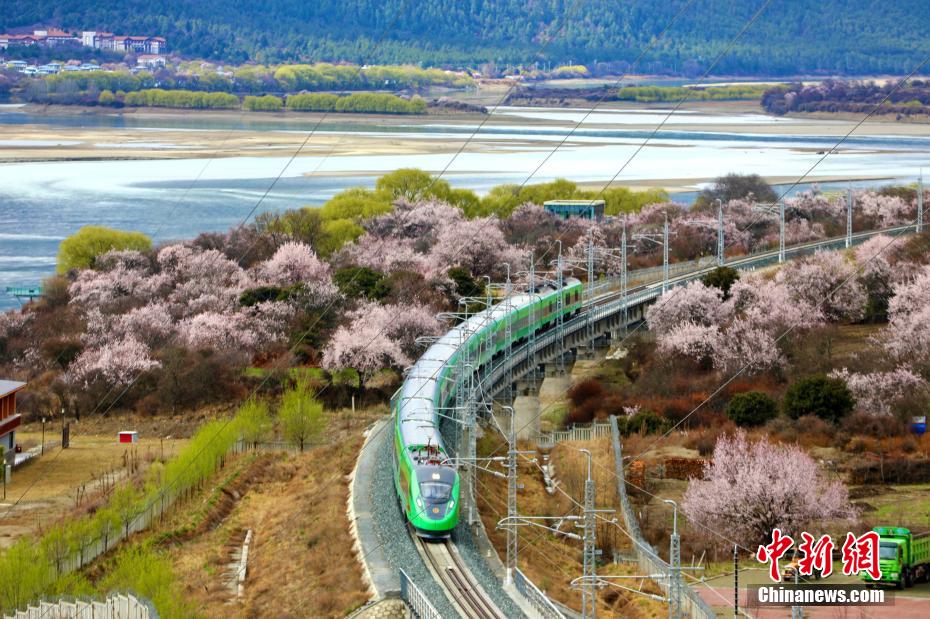 穿梭在桃花林中的拉林鐵路高原復(fù)興號。