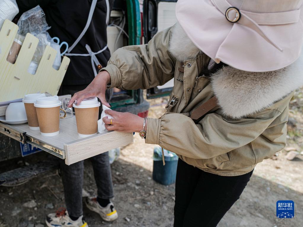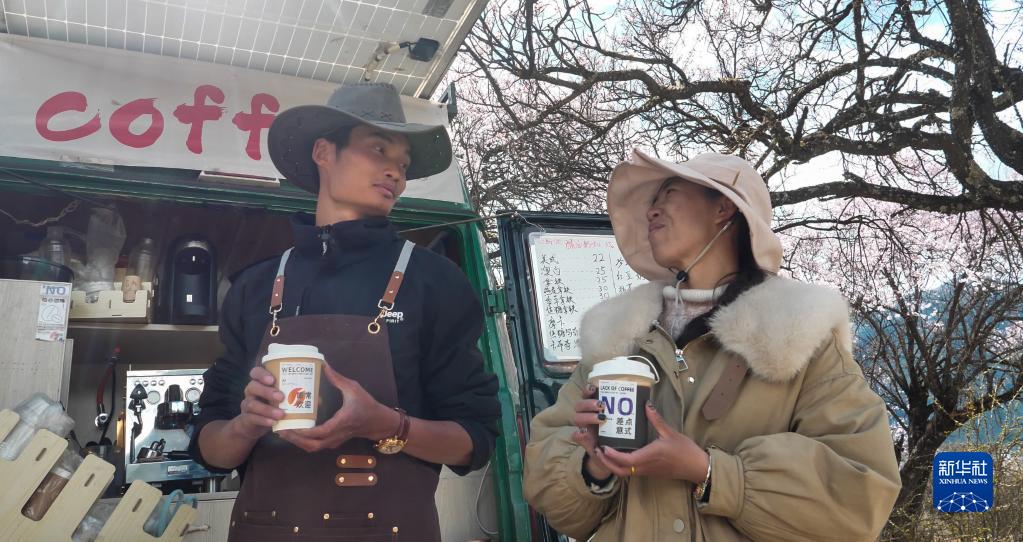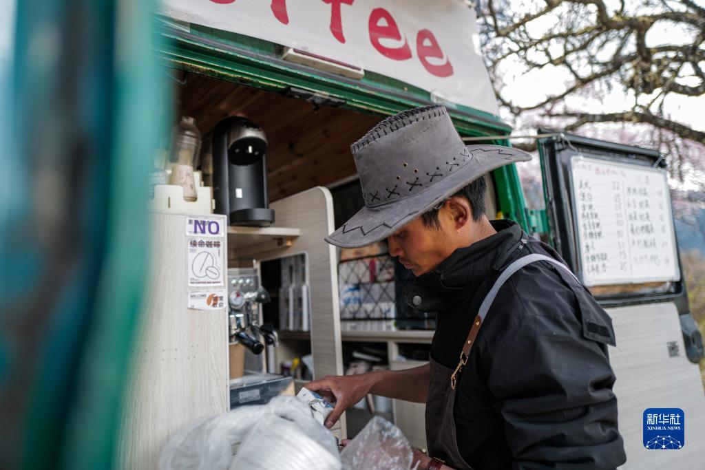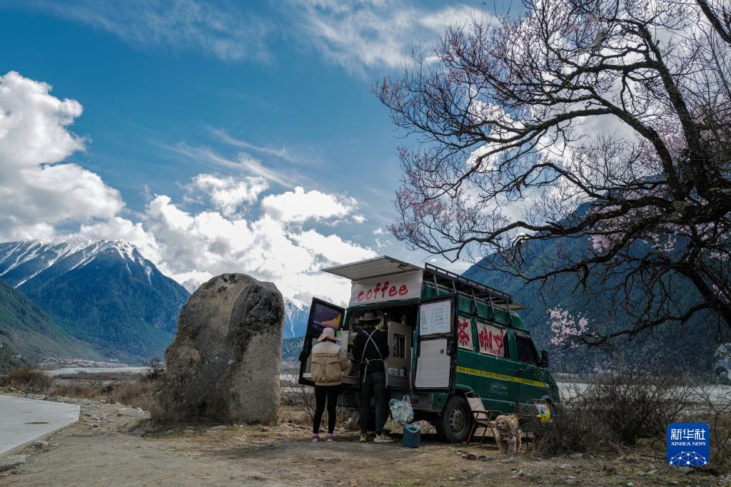 桃花谷中,咖啡車停在桃樹下,車后遠處是連綿的雪山。樹上的桃花被風吹落,一朵花瓣剛巧落在還未來得及封蓋的咖啡里,但顧客對此并不在意,“這才有林芝春天的感覺!”他說。
