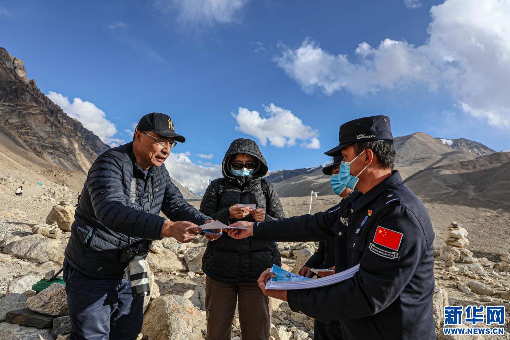 珠峰邊境派出所民警為景區(qū)游客發(fā)放安全注意事項(xiàng)宣傳單。