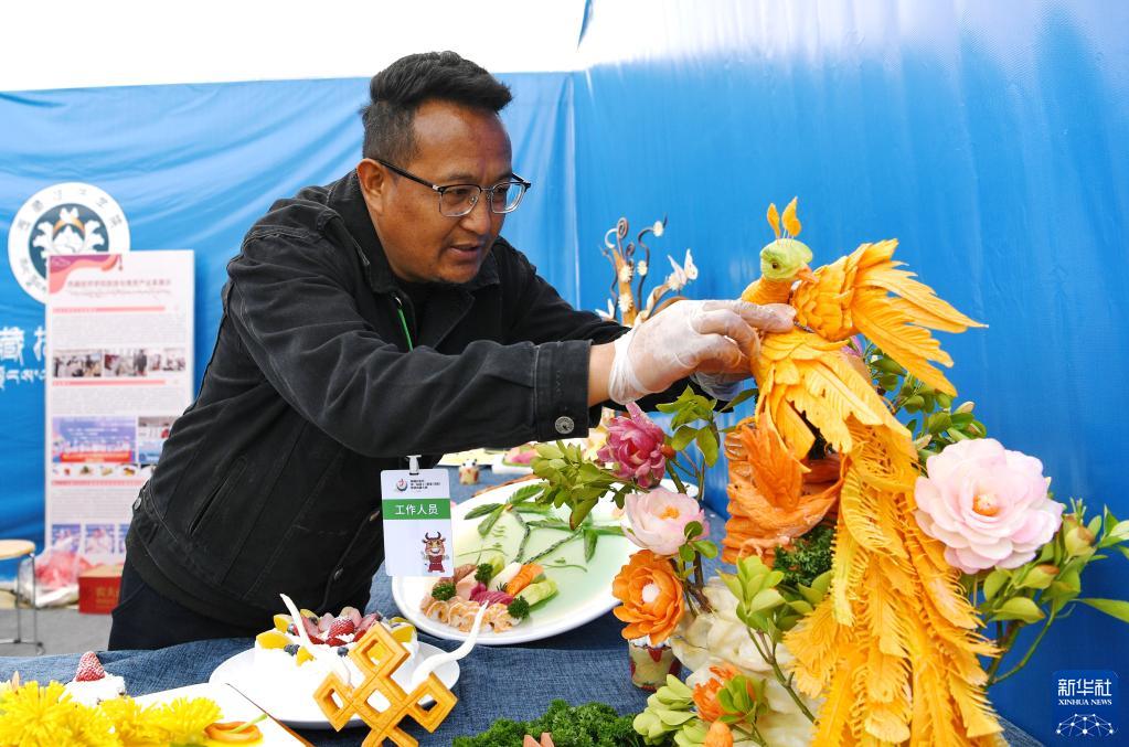 5月10日,西藏技師學院一名老師擺放食品雕刻藝術(shù)作品。新華社記者 張汝鋒 攝