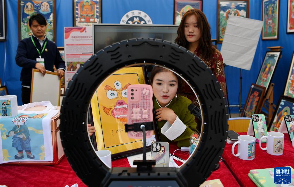 5月10日,西藏技師學院學生直播展示師生制作的手工藝品。新華社記者 張汝鋒 攝