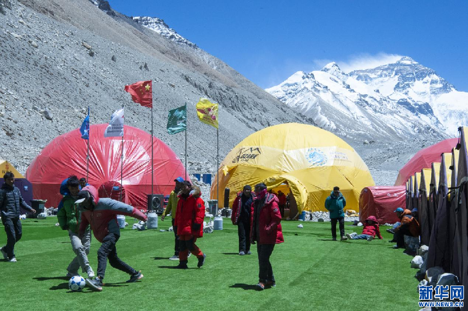 5月9日,登山隊(duì)員在珠峰大本營(yíng)踢球。新華網(wǎng) 旦增努布 攝