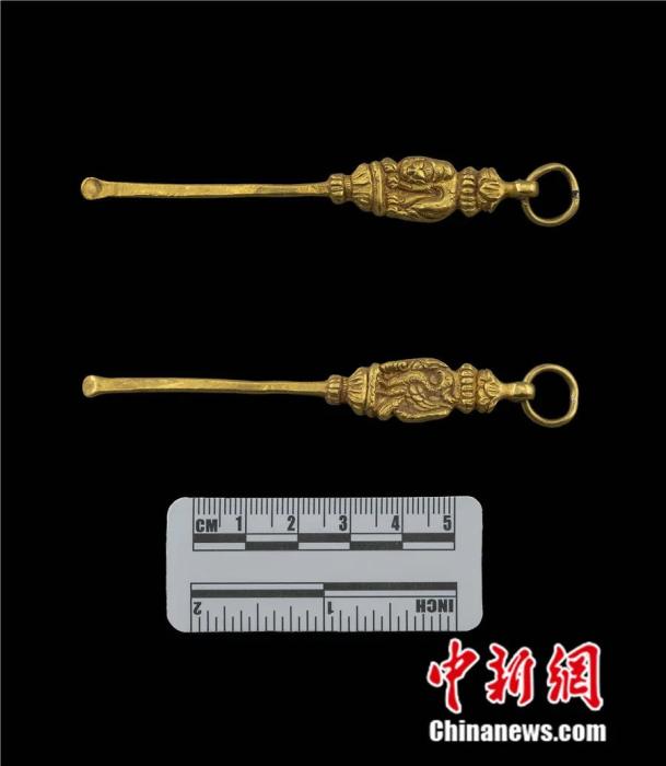 西藏自治區(qū)拉薩市當(dāng)雄縣當(dāng)曲卡鎮(zhèn),當(dāng)雄墓地出土的雄獅鳥紋金耳勺。國(guó)家文物局供圖