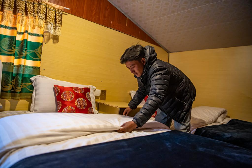在珠峰游客大本營,旦增整理自家?guī)づ衤灭^的床鋪(5月13日攝)。新華社記者孫非 攝