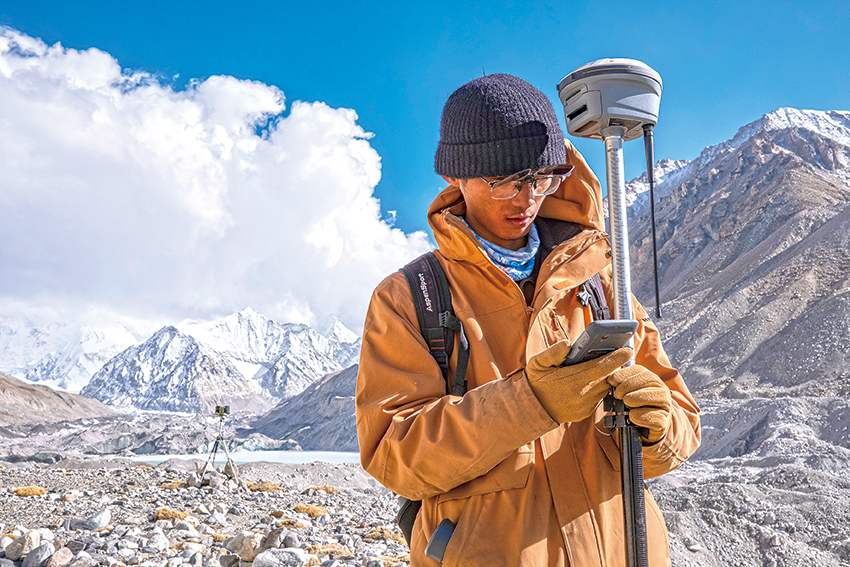 來自中國科學(xué)院西北生態(tài)環(huán)境資源研究院的科考隊(duì)員薛雨昂在對(duì)冰川進(jìn)行實(shí)時(shí)差分GPS定位(5月15日攝)。新華社記者晉美多吉攝