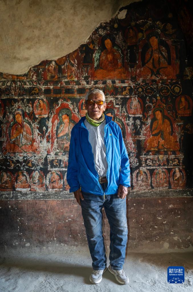 5月26日,仁增旺扎老人在皮央石窟的壁畫前留影。新華社記者 費(fèi)茂華 攝