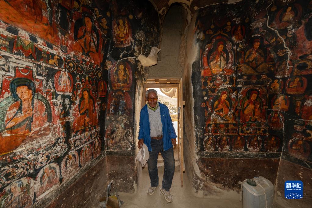 5月26日,仁增旺扎老人走進(jìn)繪滿壁畫的石窟。新華社記者 費(fèi)茂華 攝