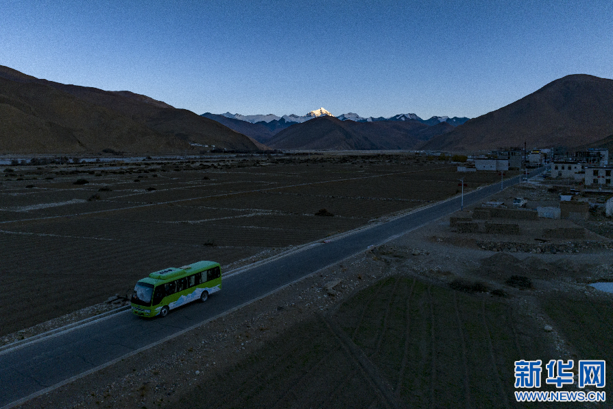 遠處的珠穆朗瑪峰與正在行駛的環(huán)保大巴(無人機照片)。新華網(wǎng) 旦增努布 攝