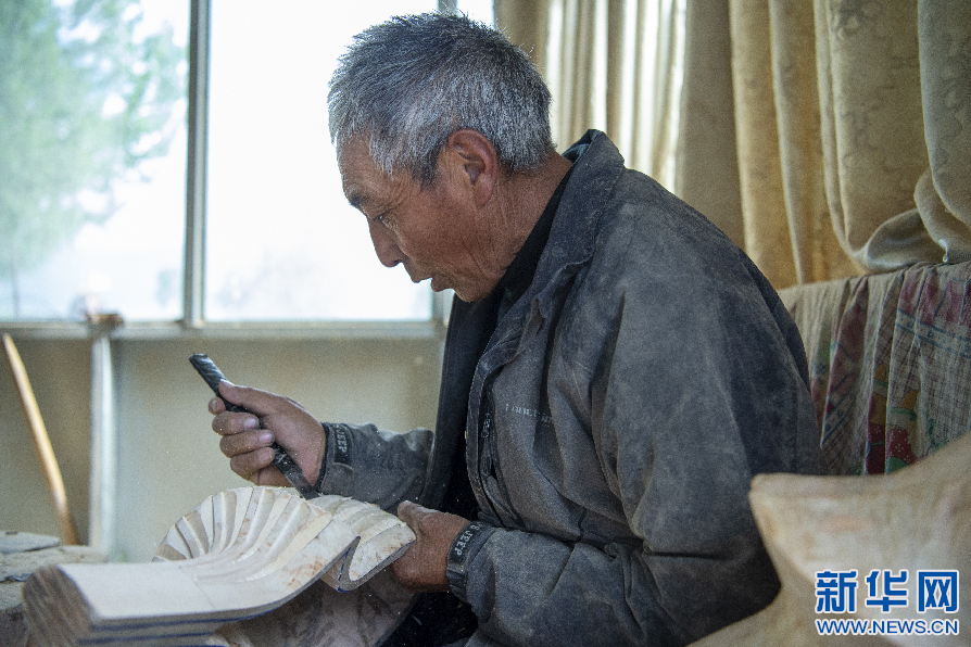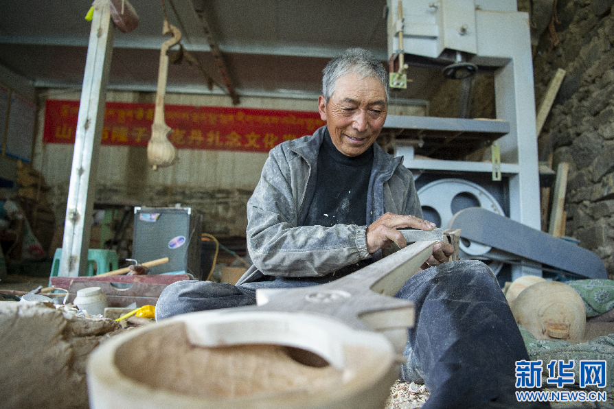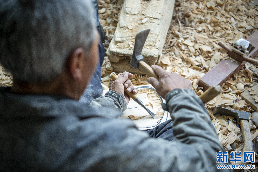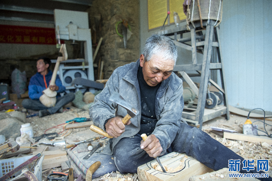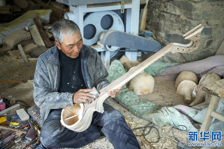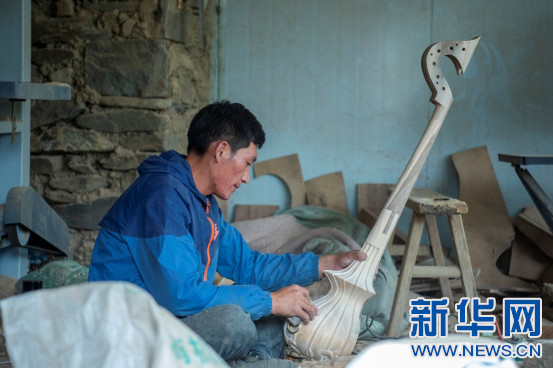 6月8日,娘嘎扎念琴制作技藝傳承人羅布次旦在制作扎念琴。新華網(wǎng) 旦增努布 攝