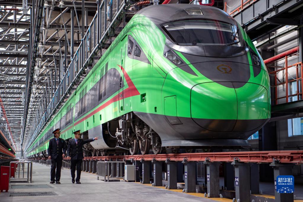 在拉薩機輛整備中心,“復(fù)興號”動車組在檢修庫進行整備作業(yè)(1月11日攝)。新華社記者 孫非 攝