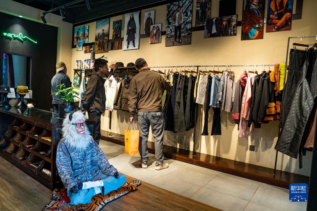 在拉薩一家以“雪怪”為主題的藏式時裝店,顧客們選購商品(6月18日攝)。新華社記者 孫非 攝