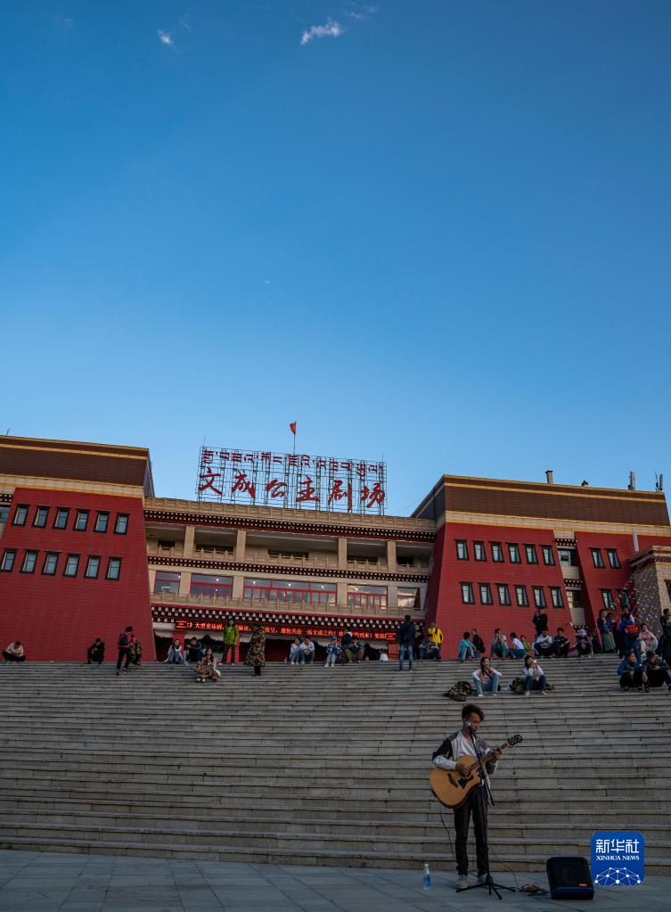在文成公主劇場前,一名街頭藝人表演吉他彈唱(6月6日攝)。新華社記者 孫非 攝