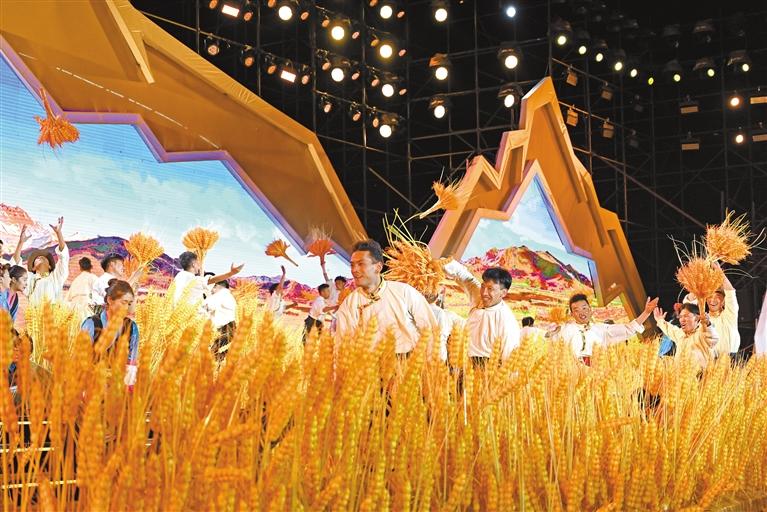聲,是情的流露;舞,是意的表達(dá)。開幕式文藝表演由序《珠峰頌歌》、上篇《戀上青稞》、下篇《極境暢想》和尾聲《吉祥日喀則》組成。序《珠峰頌歌》中,150名演員深情合唱歌曲《珠穆朗瑪》,表演節(jié)奏歡快的男女踢踏舞等,展現(xiàn)日喀則高質(zhì)量發(fā)展的加速度和拼搏奮進(jìn)的精氣神。上篇《戀上青稞》,展示日喀則各族群眾勤勞、樂觀、向上的精神風(fēng)貌和獨(dú)具魅力的地域文化。下篇《極境暢想》,以青稞美酒作為表現(xiàn)載體,以游客的視角介紹日喀則文旅資源,并通過藏戲和昆曲等多種文化藝術(shù)碰撞,展示日喀則在打造面向南亞大通道的發(fā)展機(jī)遇中,廣泛開展對外開放交流合作。尾聲《吉祥日喀則》,展示日喀則海納百川、開放包容的胸襟和熱情。