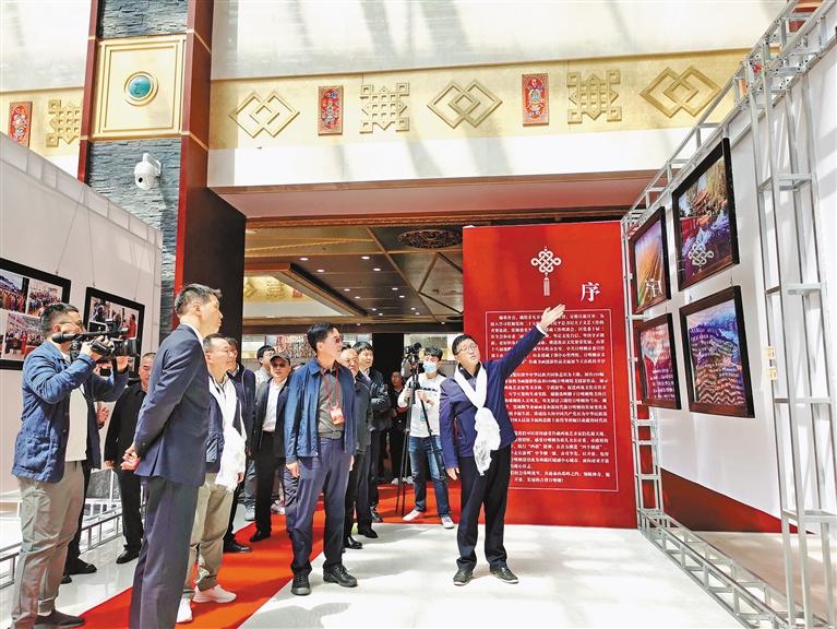 圖為“峰·彩”魯藏書畫攝影作品交流展上,工作人員在講解作品。