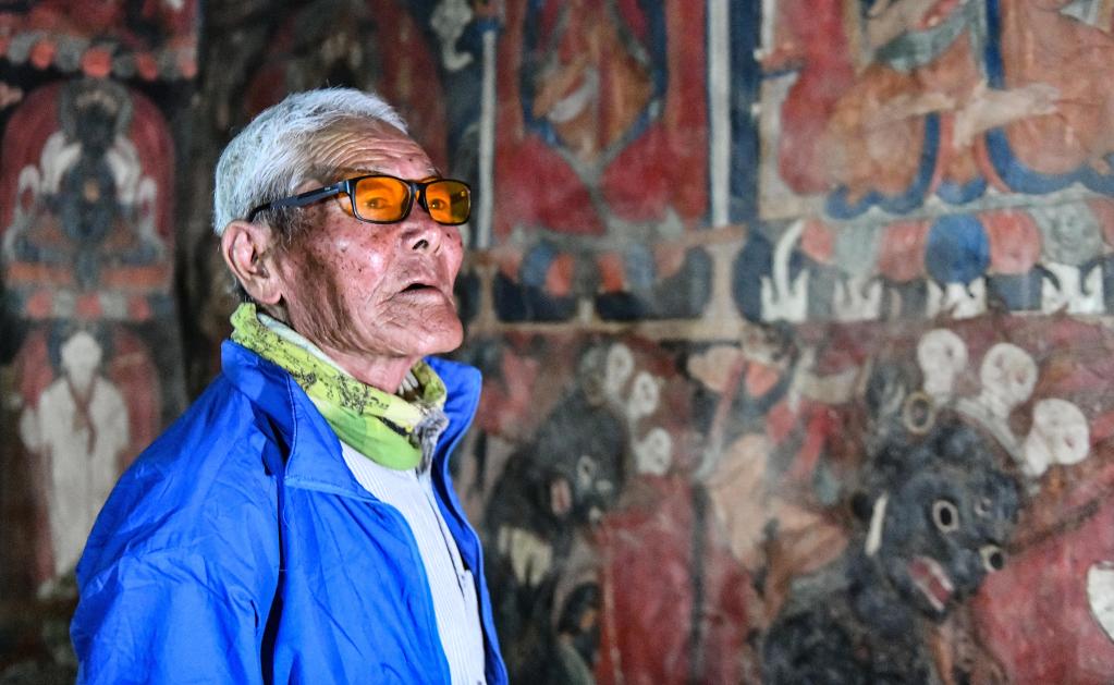 仁增旺扎老人查看壁畫(5月26日攝)。新華社記者 晉美多吉 攝
