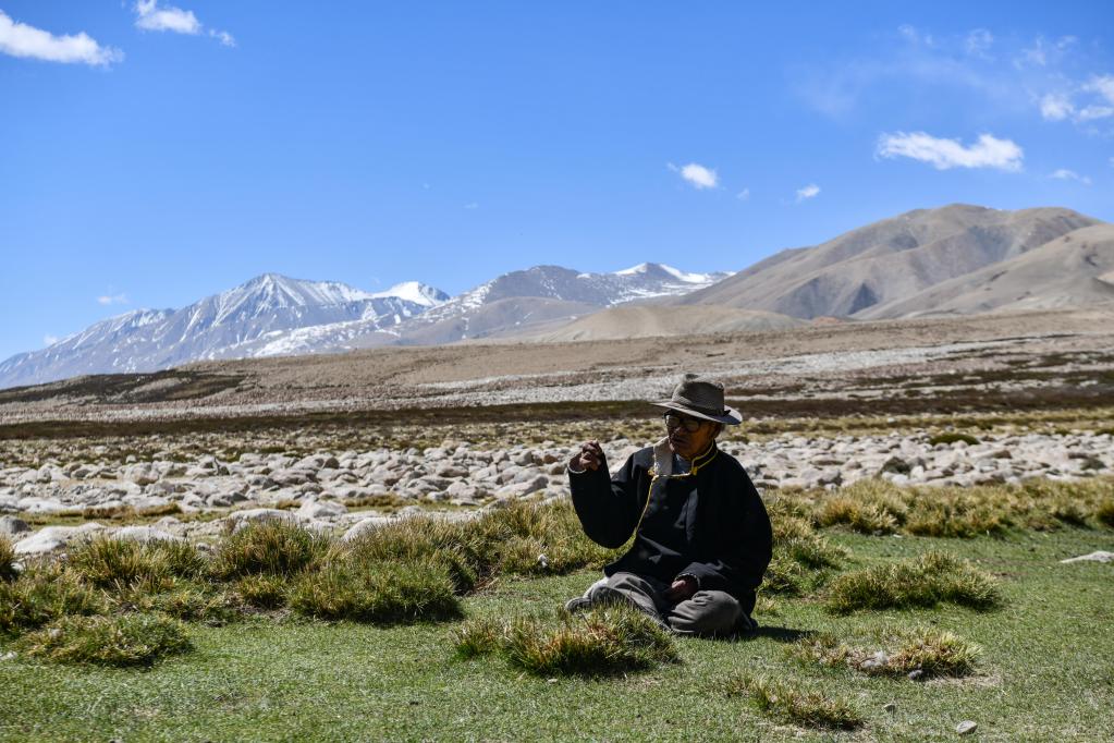 洛桑占堆在“三代房”前的草地上回憶當(dāng)年的場景(5月28日攝)。新華社記者 晉美多吉 攝