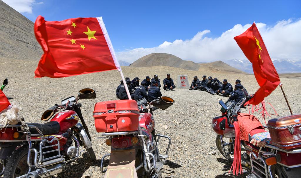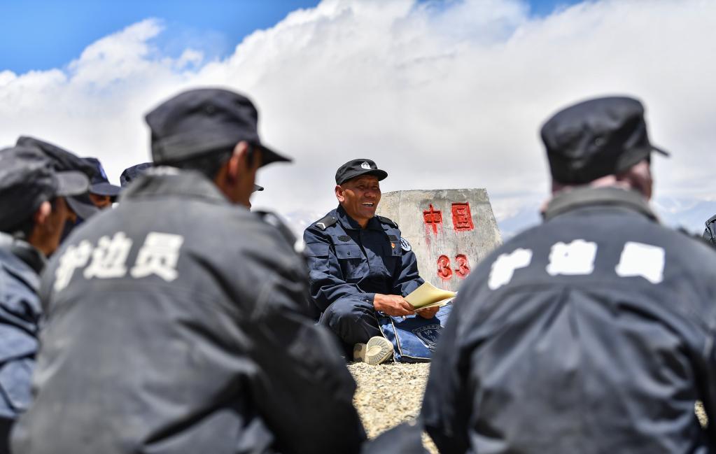 在33號界碑處,護(hù)邊隊(duì)在隊(duì)長石角(右二)的帶領(lǐng)下開展學(xué)習(xí)(6月2日攝)。新華社記者 晉美多吉 攝
