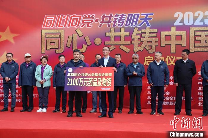 圖為啟動儀式上,北京同心共鑄公益基金會向昌都市捐贈了價值2100萬元人民幣的藥品及物資。 中新社發(fā) “同心·共鑄中國心”組委會宣傳處 供圖