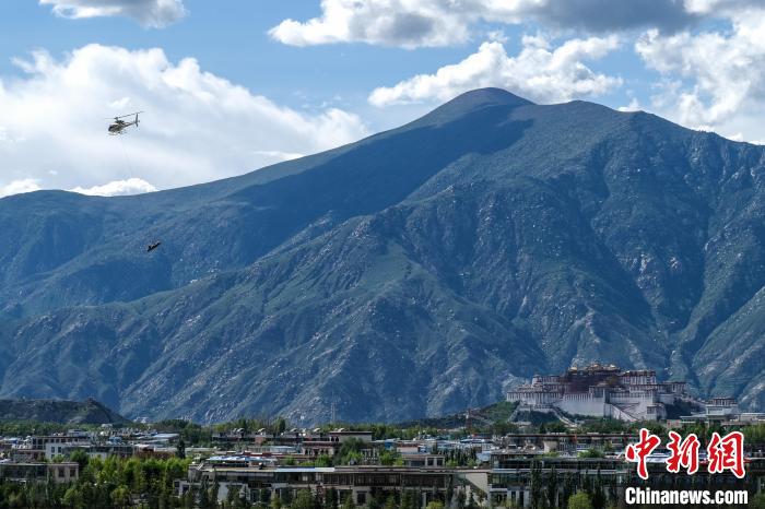 8月8日,空客H125直升機(jī)在拉薩上空演示吊裝應(yīng)急救援設(shè)備。中新社記者 江飛波 攝
