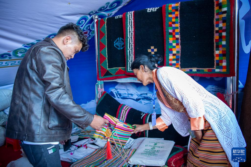 普蘭縣細(xì)德村的村民次仁卓瑪(右)在展銷會(huì)上向顧客介紹產(chǎn)品。