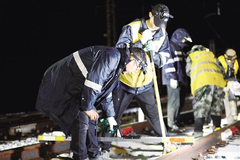21時(shí)30分,作業(yè)中,暴雨傾盆而下,瞬間覆蓋了整個(gè)施工現(xiàn)場,噼里啪啦地打在現(xiàn)場作業(yè)人員身上。早已經(jīng)歷過無數(shù)次風(fēng)雨洗禮的他們,握緊手中的工具,按照分工忙碌起來,有的測量數(shù)據(jù)、有的配合作業(yè)、有的檢查設(shè)備、有的盯控安全……整個(gè)作業(yè)現(xiàn)場忙而有序,這場突降的暴風(fēng)雨,儼然已成為促使他們奮進(jìn)的鼓點(diǎn),他們正用昂揚(yáng)的斗志,奏響高原鐵路人的“天路夜曲”。