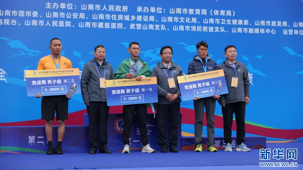 圖為2023雅礱文化旅游節(jié)環(huán)城馬拉松賽競速跑男子組頒獎典禮(8月26日攝)。新華網(wǎng) 柑丹鴦琦 攝