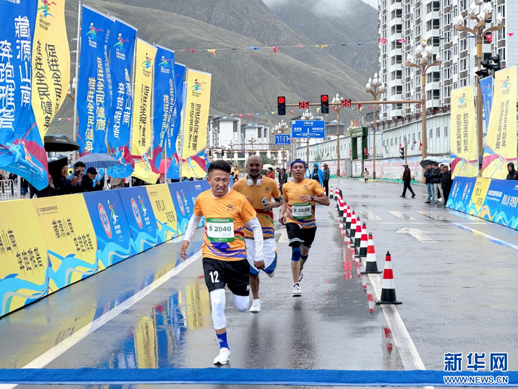 圖為2023雅礱文化旅游節(jié)環(huán)城馬拉松賽選手到達終點(8月26日攝)。新華網(wǎng) 柑丹鴦琦 攝