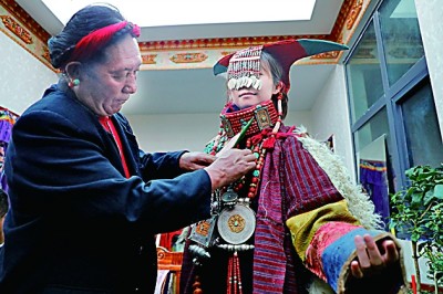 眾多的藝術(shù)形式當(dāng)然也會催生出絢爛多彩、雍容華貴的普蘭服飾,其中最有名的當(dāng)數(shù)普蘭“宣”服(又稱飛天服),單是穿戴這套服飾就要用一個多小時。地處貿(mào)易要道的普蘭人,將遙遠(yuǎn)的珊瑚、黃金、蜜蠟、白銀、綠松石、珍珠全都裝飾在“宣”服上,展示著對這襲錦袍的無比珍視。家族世代傳承“宣”服制作技藝的才旺多吉現(xiàn)在不僅把技藝公開傳授,每年單靠制作“宣”服,純收入就能達(dá)到四五萬元,而且通過普蘭的邊貿(mào)市場,這些服飾還能賣到尼泊爾和印度。
