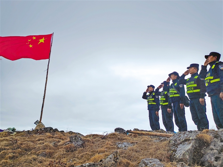 立新邊境派出所民警前往仁滇牧場巡邏踏查時向國旗宣誓。圖片由日喀則邊境管理支隊提供