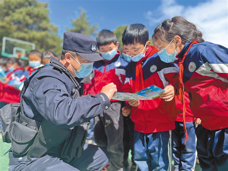 林芝邊境管理支隊南伊邊境派出所副所長趙軍為小學生開展安全宣傳,講解民族團結(jié)相關(guān)政策。記者 張猛 攝