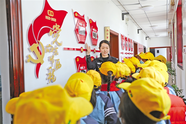 阿里邊境管理支隊塔爾欽邊境派出所民警向小學生介紹黨史知識。